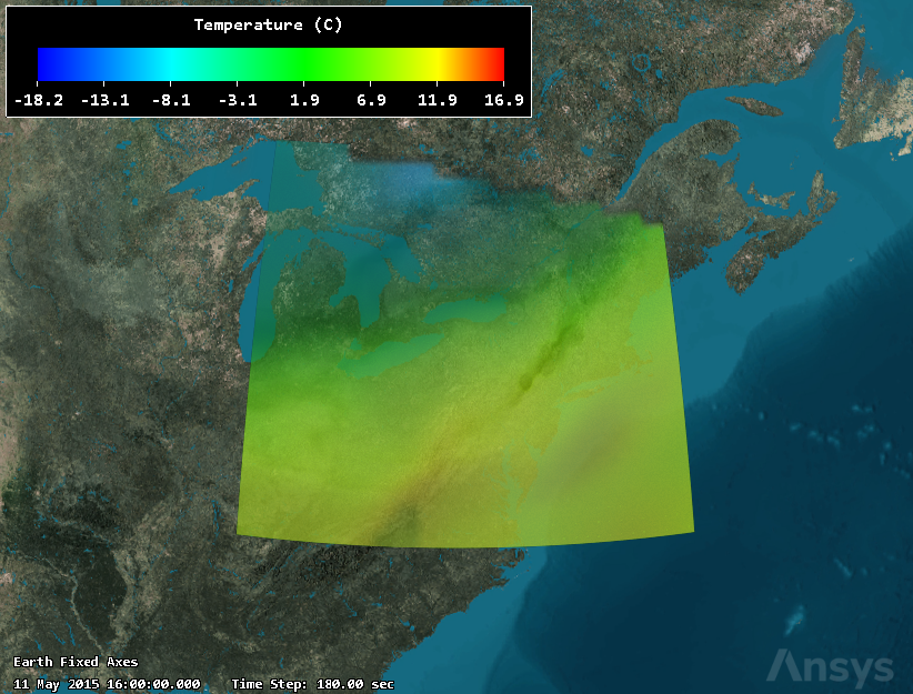 3. You can see how data display changes over time. The graphics of the Volumetric object convey the changing temperature patterns as they move across the continent.