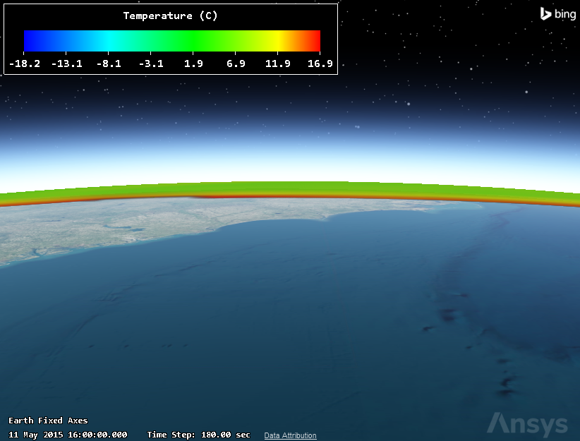 With your data finally loaded into a Volumetric object in the STK application, and the graphics now properly configured for display, you can animate your scenario to exhibit the data as it changes over time.