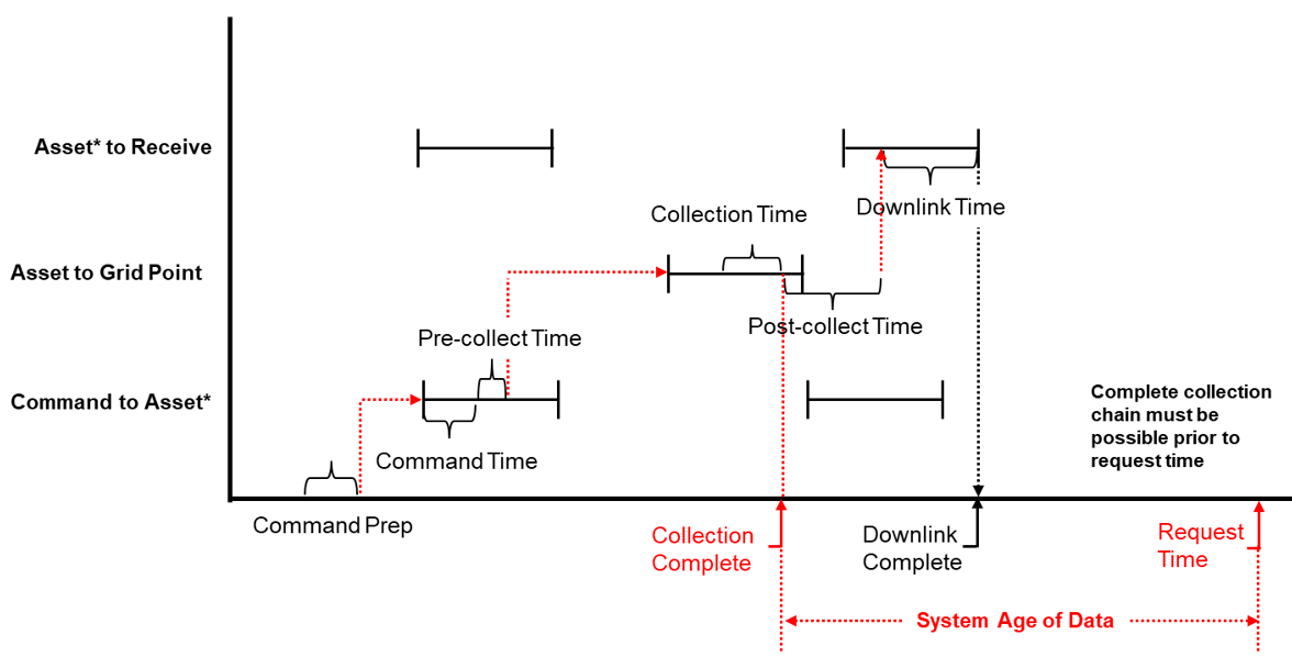 The System Response Time is then computed as: (Time of completion of data downlink – Time of collection request). The dynamic value of System Response Time can be zero only if all delays are set to zero and if simultaneous access exists between a command station, the collection asset and a receive station.