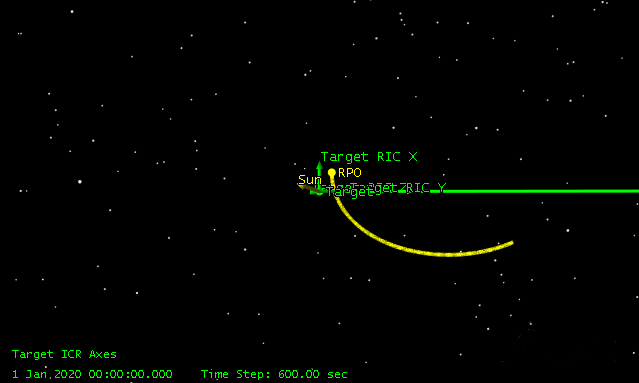 The following picture shows an initial state in which the satellite is moving relative to the target. This is propagated for six hours, at which point this sequence stops all relative motion.