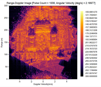 You can see the plot of data on the right. You should see radar reflection return for all the facets in your analysis area. First, set the Waterfall contrast properties to match the optimal settings you used in the Analysis tab. Then try out some different ways to view the data.