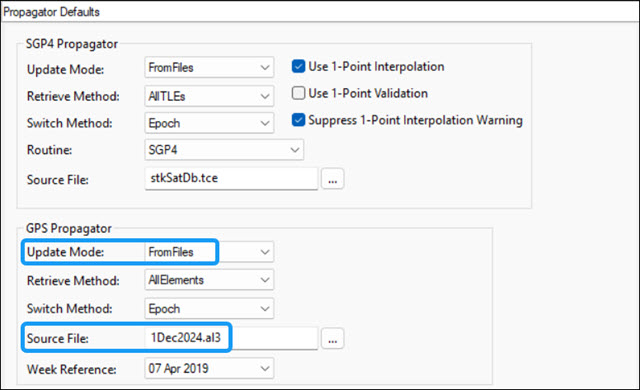 The Propagator default options enable you to set preferences for the propagators in the STK application. Set the default SGP4 propagator to point to the local TLE file you just downloaded.