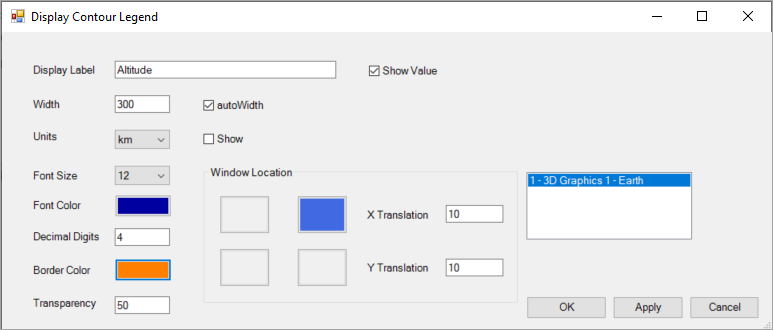 | Window Location | The location where the legend displays on the graph. The legend can be located in each corner of the 3D window. The default location is upper right. |