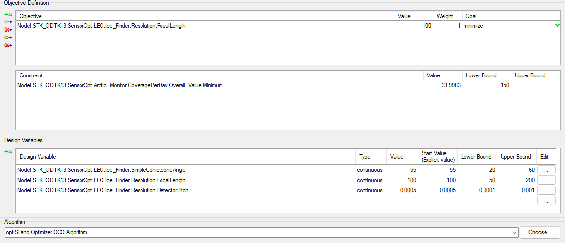Use the STK Analyzer Optimization capability, by means of the ModelCenter software's Optimization tool, to minimize the focal length requirement for the sensor while maintaining a minimum coverage capability of 150 seconds per day for your coverage area.