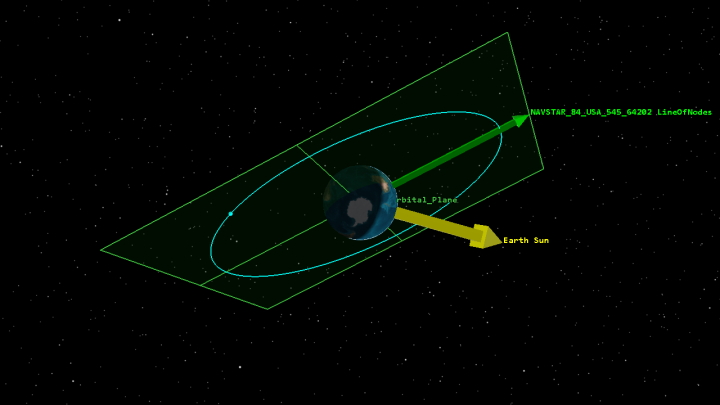 You first need to add the Earth Sun vector and the orbital plane for the GPS satellite to this scenario in order to visualize the beta angle. The Earth Sun vector is predefined. Since the Earth Sun vector displays originating from the Earth, you will add this vector by updating the 3D Graphics window's