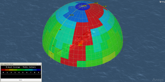 N Asset Coverage measures the number of assets available simultaneously during coverage, where N is between zero and the total number of assets defined in the coverage definition. You want to examine the lowest number of satellites that you can track by pointing the sensor at various locations. By selecting the location with the highest minimum, you can maximize tracking of the satellites.