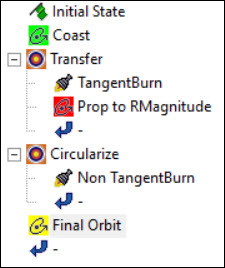 Use the Propagate segment to model the movement of the spacecraft along its current trajectory until meeting specified stopping conditions. The segment uses the defined propagator and integrator to propagate the orbital state, adding each point to the ephemeris as it goes.