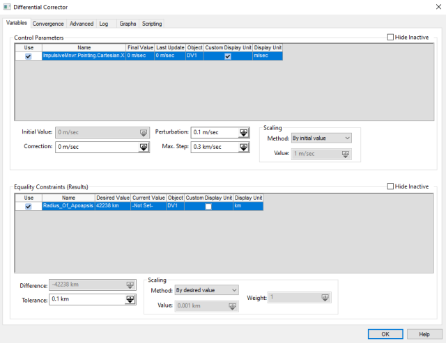 Use the radius of apoapsis as the equality constraint (result) with a goal of 42,238 kilometers. Astrogator will use radius of apoapsis to determine the required Delta-V.