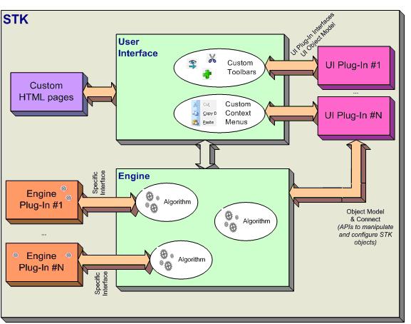 AGI provides a variety of ways to extend our products. These extensibility mechanisms can be divided into two distinct areas--user interface extensibility and engine extensibility. User interface extensibility allows you to create custom graphical user interfaces (GUI) and controls for STK to provide user-defined workflows which can combine STK and in-house functionality. Engine extensibility options (STK Engine Plugins) allow users to customize just those aspects of the modeling that are really non-generic while leveraging all the other generic capabilities of the COTS software.