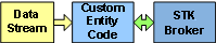 In this example, the entity library and the STK broker plugin are used to display data directly from a raw data stream. The “Custom Entity Code” block is converting the raw data stream into entity objects directly, without writing an entity provider plugin. It is then setting all the parameters, graphical and otherwise, for each entity itself and putting the entities directly into the STK broker. It is a good workflow to use if you have a very small number of tracks - especially if they have a high update rate; it cuts out much of the processing overhead you would want in order to process large volumes of data, with the benefit of delivering better performance. The down side of this workflow is that you need to micro-manage each entity yourself, which means that it is not an optimal solution for large data sets; it is best for one-off solutions where flexibility and reusability are not needed.