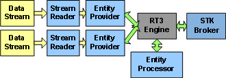Two entity provider and stream plugins are fed directly into the RT3 engine in the example above. An entity processor is then used on every entity, possibly for correlation or some other task. Entities matching query and event criteria (not shown) are then pushed into the STK broker for use in STK or AGI Viewer. This is the most common workflow of RT3; a large amount of data is fed into the client from multiple sources and processed, sorted and graphically tagged data is then output to the display.