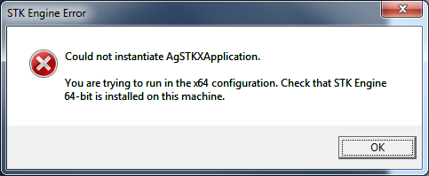 If you get this message, please make sure you selected the correct configuration for the version of STK/STK Engine installed.