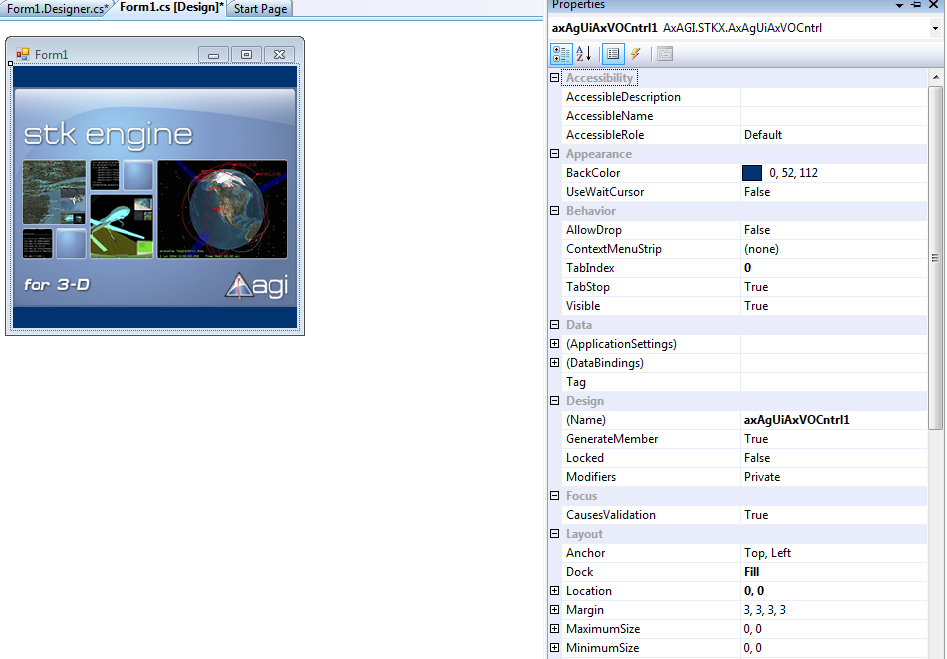 private AxAGI.STKX.AxAgUiAxVOCntrl axAgUiAxVOCntrl1; private void InitializeComponent() { System.ComponentModel.ComponentResourceManager resources = new System.ComponentModel.ComponentResourceManager(typeof(Form1)); this.axAgUiAxVOCntrl1 = new AxAGI.STKX.AxAgUiAxVOCntrl(); ((System.ComponentModel.ISupportInitialize)(this.axAgUiAxVOCntrl1)).BeginInit(); this.SuspendLayout(); // // axAgUiAxVOCntrl1 // this.axAgUiAxVOCntrl1.Dock = System.Windows.Forms.DockStyle.Fill; this.axAgUiAxVOCntrl1.Enabled = true; this.axAgUiAxVOCntrl1.Location = new System.Drawing.Point(0, 0); this.axAgUiAxVOCntrl1.Name = "axAgUiAxVOCntrl1"; this.axAgUiAxVOCntrl1.OcxState = ((System.Windows.Forms.AxHost.State) (resources.GetObject("axAgUiAxVOCntrl1.OcxState"))); this.axAgUiAxVOCntrl1.Size = new System.Drawing.Size(427, 342); this.axAgUiAxVOCntrl1.TabIndex = 0; ...