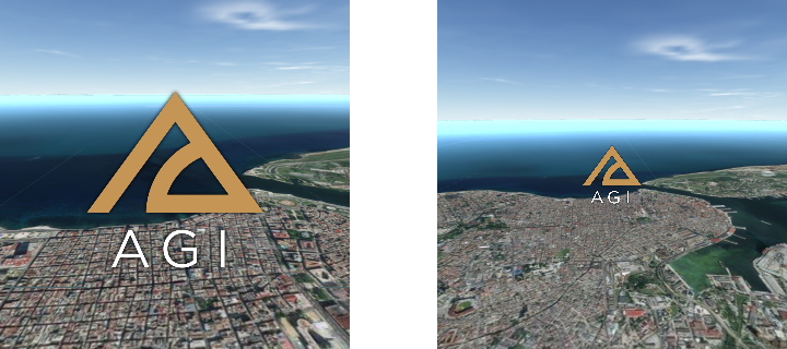 The following example demonstrates how applying an eye offset of (0, 100000, 0) affects the position of a marker from different view points. Note that an eye offset is different than a pixel offset or a world translation (e.g. offset the altitude by 10 meters).
