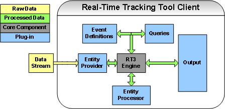 As you can see, everything starts with a raw data stream. The stream can originate from any source (e.g., hardware link, file on disk, web server, etc.). An entity-provider plugin is responsible for acquiring this data and parses and stores all relevant information as entity objects. Once these entities are created, they are inserted into the RT3 engine for further processing.