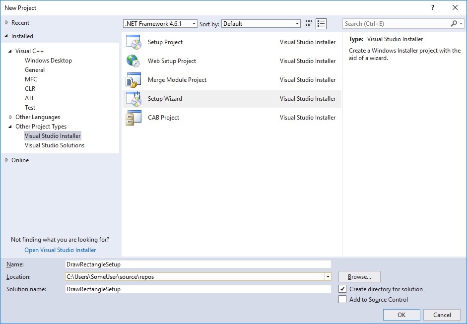 - In the New Project dialog, select Visual Studio Installer (under Other Project Types).