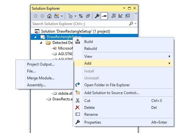 - If your install contains STK Engine Merge Modules, right click on the setup project in the Solution Explorer, and select Add, and then Merge Module... from the context menu: