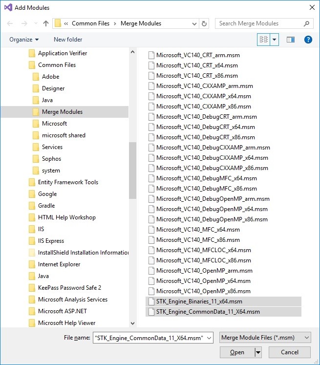 The following examples use Visual Studio 2017 to create an installation package for STK Engine applications. Instructions for including the STK Engine Merge Modules is also included. STK Engine Merge Modules will need to be included in the install if the application will be deployed on a computer where STK is NOT installed.