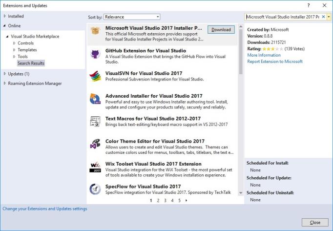 - Once shown, select Microsoft Visual Studio 2017 Installer Projects and click on the download button associated with it.