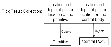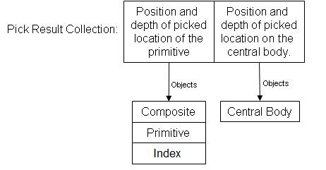 If multiple objects are at a pixel, the collection will contain multiple pick results. The first item in the collection will be the top most object. Subsequent items will be "under" the previous item. For example, if the camera is looking straight down at a primitive on the ground and Pick is called with coordinates that match the primitive, both the primitive and central body will be returned as shown below.