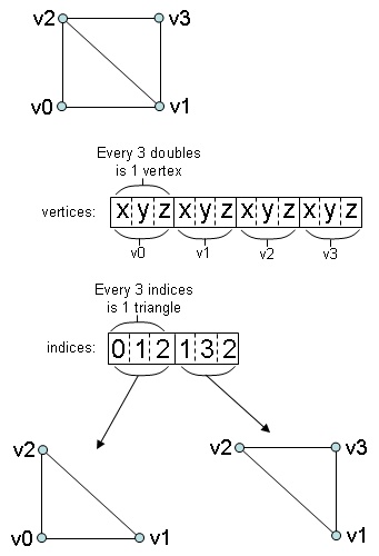 An indexed triangle list for a mesh with two triangles is shown below.