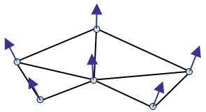 Normals are computed in a variety of ways. A straightforward algorithm to compute a normal for a position is to normalize the average of the cross products of all adjacent incident edges to that position. Once computed, normals should be stored in a separate collection that has a one-to-one mapping with the position collection. The normal at index i in the normal collection is the normal for the position at index i in the position collection as shown below.