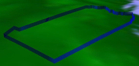 The extruded polyline triangulator computes triangles for extrusions perpendicular to the surface. The extrusion is defined by boundary positions, similar to the input to the surface polygon triangulator. In addition, the altitude for both the bottom and top of the extrusion are specified. The bottom of the extrusion is not required to be on the ground as the following example demonstrates: