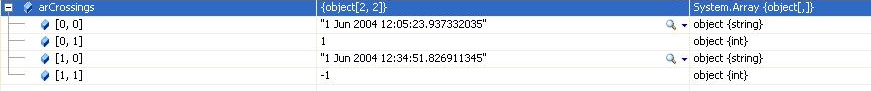 ThresholdCrossings returns a two-dimensional array containing time and direction data (negative for decreasing). The DataSets property must contain the Time dataset for this method to work correctly.
