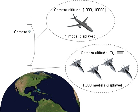 Layering is showing/hiding groups of primitives in the same general area based on display conditions. This is commonly used to show more detailed primitives as the camera becomes closer. Aggregation and deaggregation extend the layering concept so it appears that primitives expand into more primitives or collapse into less. This is frequently done based on distance to a reference point or camera altitude as the following example demonstrates.