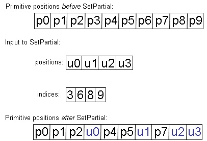 SetPartial takes a collection of positions. In addition, SetPartial also takes a collection of indices that maps the corresponding position from the position's collection to a position already in the primitive. The following example creates a point batch with 10 positions then updates 4 of the positions with SetPartial.