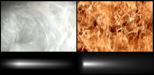 Individual frames of the smoke.avi and flame.mov videos that are mapped to replace placeholder images in the hellfireflame.anc ancillary file. Each placeholder image's alpha mask is shown below each frame of the replacement video. |