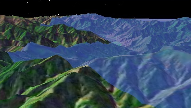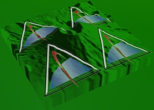 The surface mesh is similar to the triangle mesh, but it only renders meshes on the surface of a globe. Arbitrary mesh or meshes at altitude cannot be rendered with the surface mesh. The main advantage of the surface mesh over the triangle mesh is it will conform to terrain as shown below.