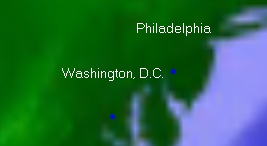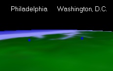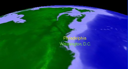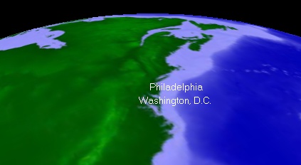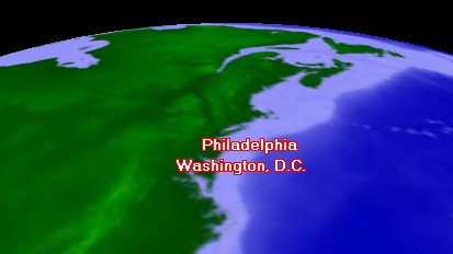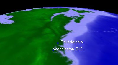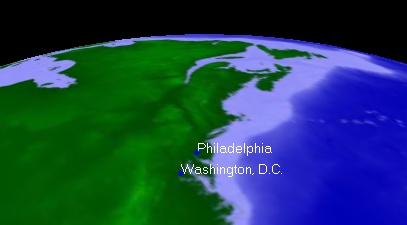 Using TextBatchPrimitiveOptionalParameters, text can be offset from its position in either pixel or eye coordinates. In pixel coordinates, increasing x moves from the left toward the right side of the window, and increasing y moves from the bottom to the top. To move "Philadelphia" to the right so the "P" and the point do not overlap, apply a pixel offset of 10.