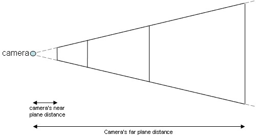 The following image (not to scale) shows an example where 3 view frustums are created based on the NearPlane, FarPlane, and FarNearPlaneRatio properties. Note that view frustums farther away from the camera are larger.