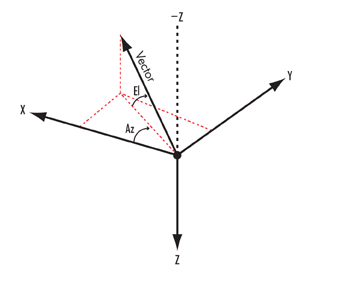 where, LH (Local Horizontal) X axis = constrained toward local north VVLH (Vehicle Velocity, Local Horizontal) X axis = constrained toward velocity vector How Azimuth and Elevation are DefinedThe following frames are used in defining azimuth (Az) and elevation (El): Vehicle Velocity Local Horizontal (VVLH) coordinate system